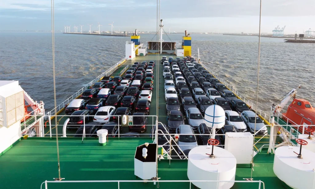 Vehicles are driven onto the ship via ramps and secured in designated areas for safe transport.